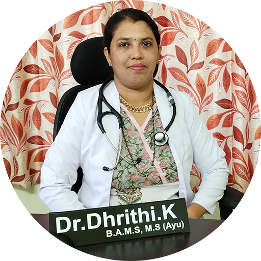 Dr. Dhrithi, holding a BAMS and an MS in Ayurveda Dhanwantari, comes from a distinguished lineage of traditional healers, with her great-grandfather being a renowned Ayurvedic vaidya. Her profound knowledge of Ayurveda and traditional sciences is complemented by her deep passion and commitment to societal well-being. Having grown up immersed in Ayurvedic principles and traditional medicinal practices, Dr. Dhrithi developed a strong foundation in the field from an early age. She earned her undergraduate degree from SDM College, Hassan, and pursued her Master’s in Ayurvedic Surgery (MS) from SDM College of Ayurveda, Udupi, Karnataka. With 18 years of extensive experience, Dr. Dhrithi has gained exceptional expertise in managing various health conditions, particularly in the areas of female health, pediatric care, and musculoskeletal disorders. Her dedication to holistic healing and patient care has established her as a trusted and accomplished practitioner in the field of Ayurveda.